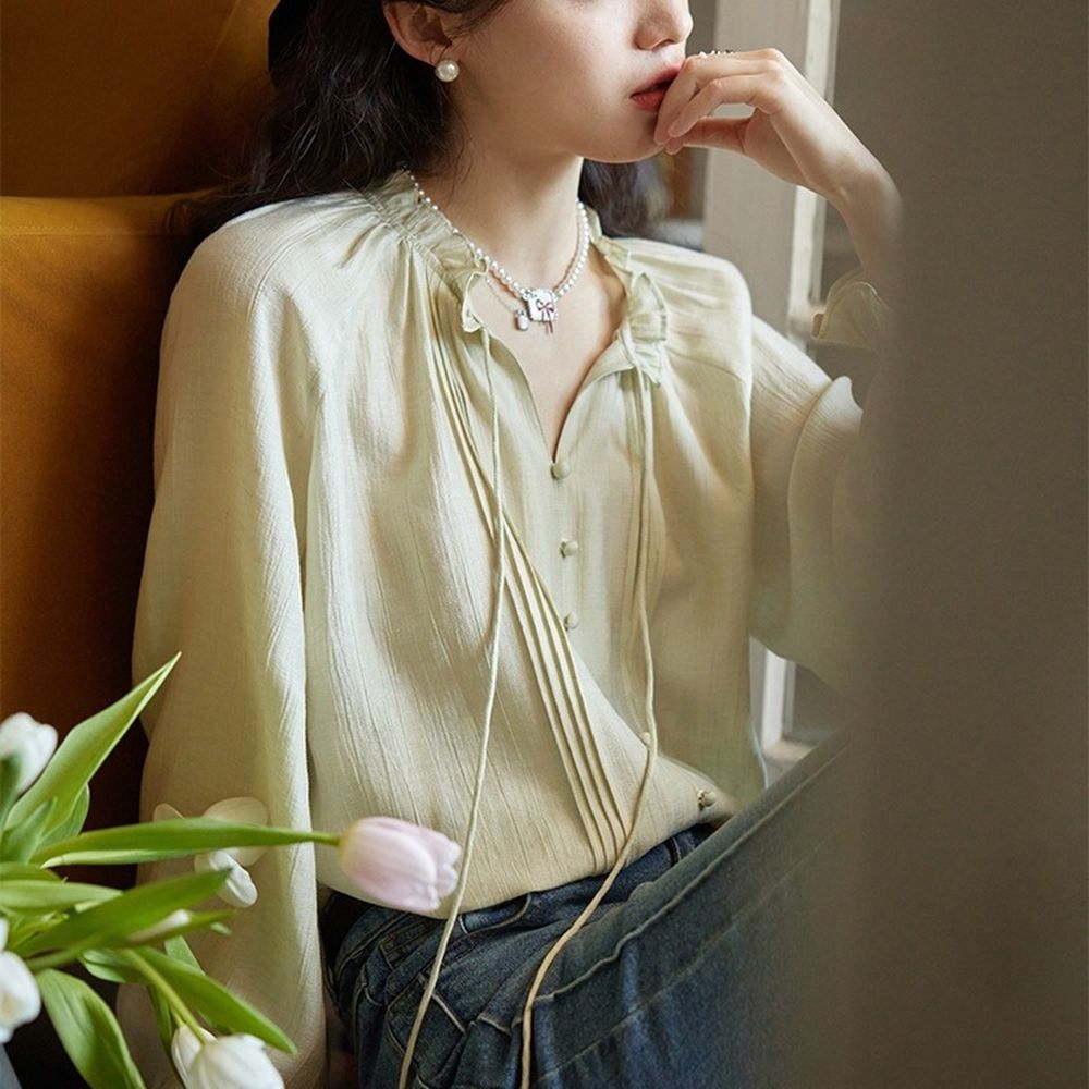 Bow Tie Top French Retro Ruffle Edge Apricot Lace Collar Shirt