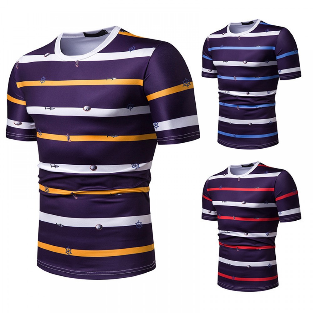 New Summer Men's Short-Sleeved T-Shirt Mens Contrast Striped Slim Casual T-Shirts